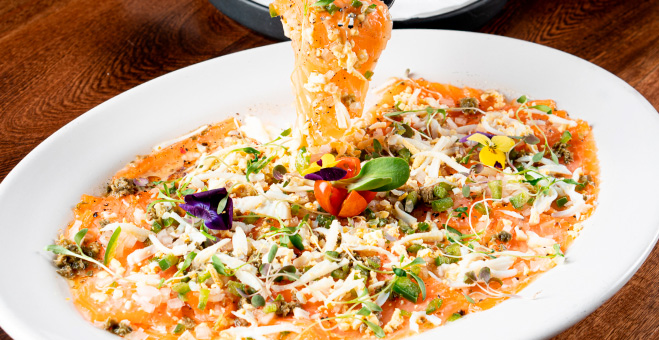 | CARPACCIO DE SALMÓN 180 gr EN CORTE FINO CON CEBOLLA, ALCAPARRAS Y HUEVO CON UN TOQUE DE ACEITE DE OLIVA, SAL Y PIMIENTA |