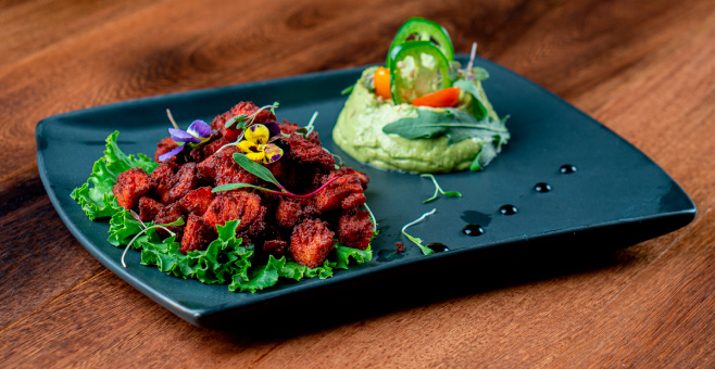 | CARNITAS DE ATÚN 250 gr SERVIDAS CON GUACAMOLE, CEBOLLAS CAMBRAY Y CHILES TOREADOS |