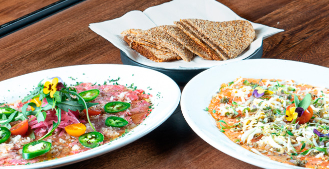 | CARPACCIO DE BIFE DE LOMO 180 gr EN CORTE FINO CON CHAMPIÑONES, JITOMATE CHERRY ARÚGULA Y PESTO |